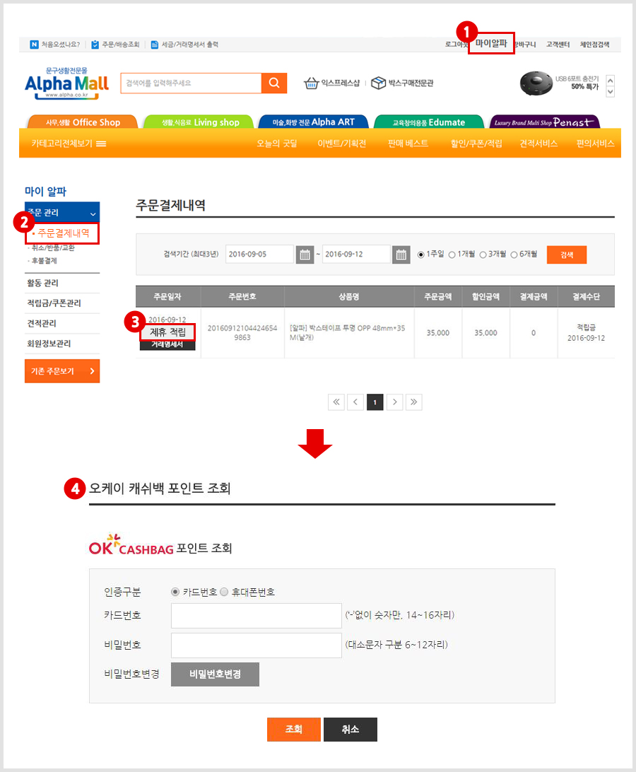알파몰은 OK캐시백 카드에 한해서만 적립이 가능합니다.(할인불가)