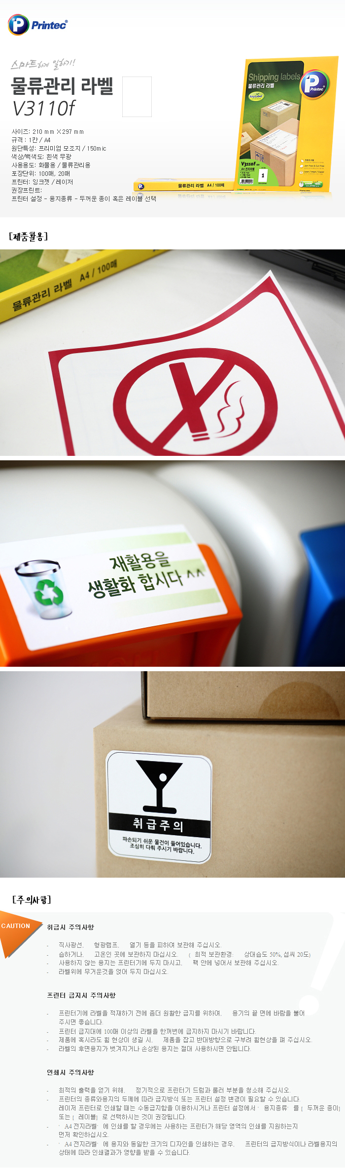 ★4월 월간특가★ [프린텍] 애니라벨 물류관리용라벨 V3110F-100(100매/1칸/풀사이즈)